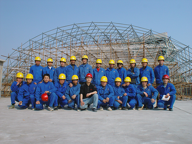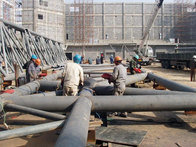 工程部每年對項目部及施工隊伍進行四次專業(yè)技能培訓,在鋼結構工程開工、鋼結構主體開工及完工、圍護結構開工及完工時派人對項目部施工進行施工質量及安全檢查。項目部對工程施工實行項目管理,每個項目部配備九大員及兩個鋼結構專業(yè)施工隊伍,具備輕鋼、重鋼、桁架、網(wǎng)架、圍護、采光結構施工能力。