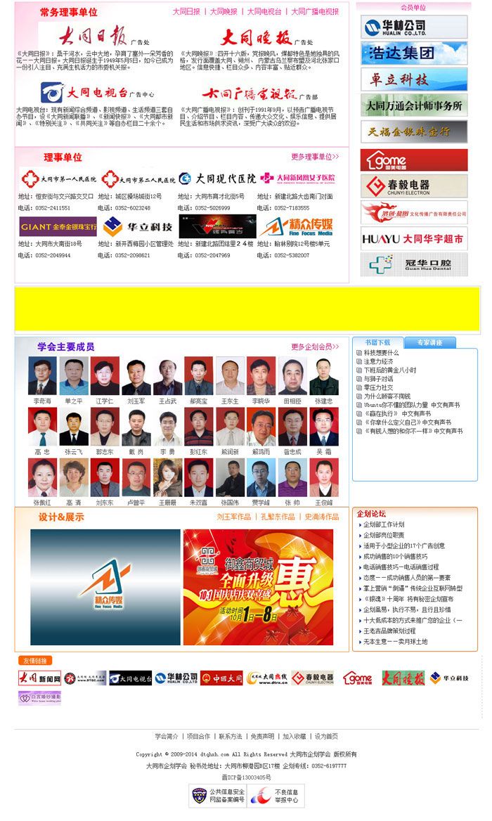 大同市企劃學(xué)會(DESA)是經(jīng)山西省大同市民政局、社科聯(lián)審批注冊成立的地區(qū)性企劃組織、具有獨立法人資格的非營利性社會團(tuán)體。2008年末開始籌備,2009年3月初正式注冊成立。是集合我市主流媒介、企業(yè)經(jīng)營管理者、商業(yè)策劃者、理論研究者等四個層面為一體的一個溝通交流、相互