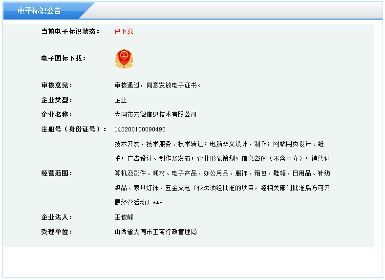 8月30日,宏微信息技術(shù)通過山西省工商行政管理局經(jīng)營性網(wǎng)站認證,獲得經(jīng)營性網(wǎng)站“電子標識”,工商紅盾標識號碼為