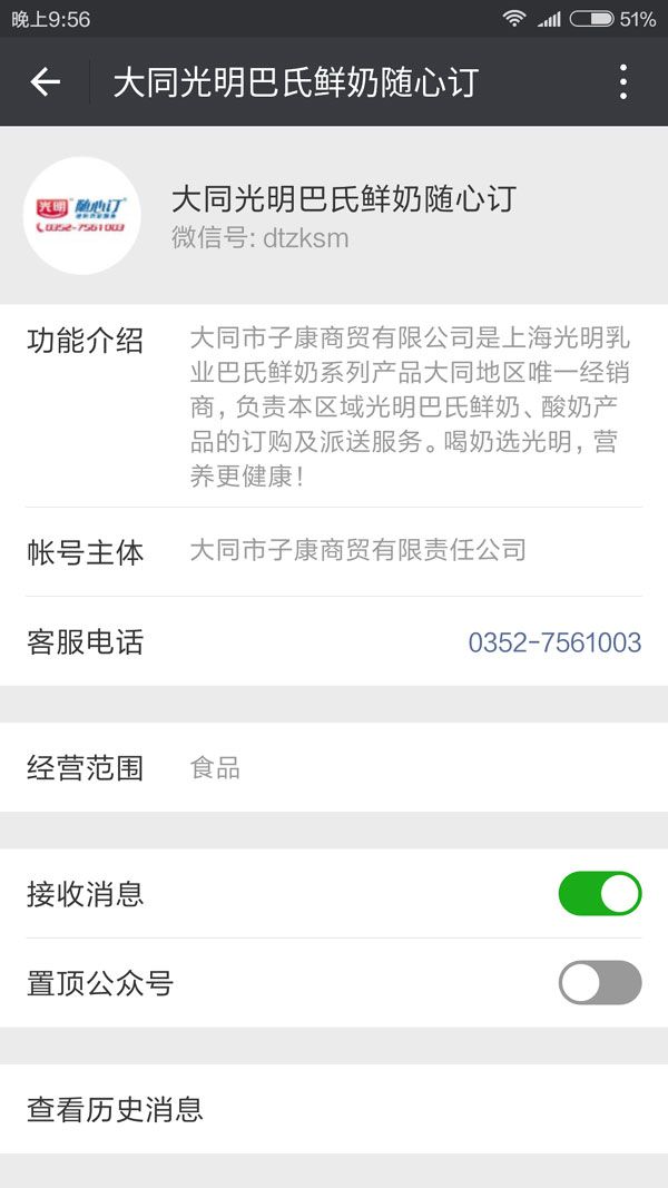 第一步:微信關注“大同光明巴氏鮮奶隨心訂”微信公眾平臺