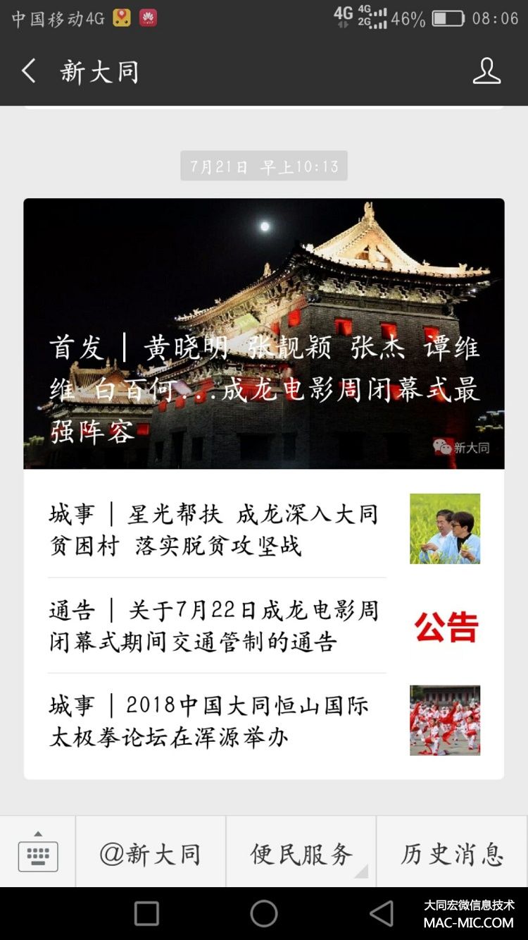 7月21日,由宏微信息技術(shù)旗下新大同微信平臺(tái)首發(fā),新大同網(wǎng)、今日頭條新大同號(hào),搜狐新大同號(hào)等全媒體陣容推出的《首發(fā) | 黃曉明 張靚穎 張杰 譚維維 白百何...成龍電影周閉幕式最強(qiáng)陣容》一文在網(wǎng)絡(luò)一經(jīng)推出就開(kāi)始熱傳。成龍電影周在大同舉辦,閉幕式廣受關(guān)注,新大同內(nèi)容發(fā)送及時(shí),內(nèi)容獨(dú)特,編排新穎,受到眾多關(guān)心大同旅游發(fā)展、關(guān)系成龍動(dòng)作電影節(jié)的網(wǎng)友一致好評(píng)。