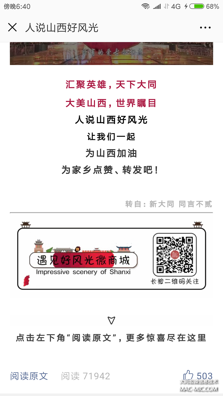 截止發(fā)稿時(shí),新大同原創(chuàng)微文《首發(fā) | 黃曉明 張靚穎 張杰 譚維維 白百何...成龍電影周閉幕式最強(qiáng)陣容》在人說(shuō)山西好風(fēng)光的閱讀量已經(jīng)達(dá)到7W+,新大同平臺(tái)通過(guò)不斷完善創(chuàng)新發(fā)展,為我們大同旅游、為山西旅游發(fā)展不斷貢獻(xiàn)自己的小小力量。