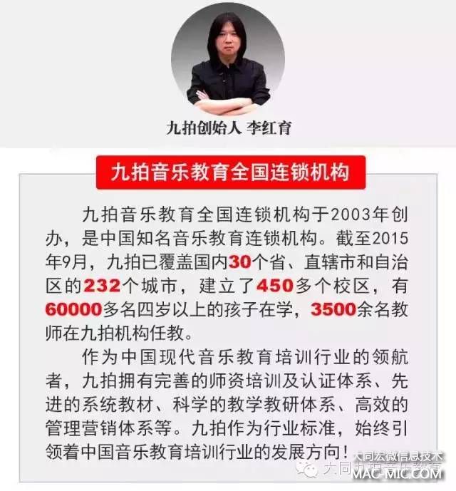 九拍教育科技集團(tuán)由李紅育老師于2003年創(chuàng)建,2015年九拍音樂教育全國連鎖強(qiáng)勢進(jìn)駐大同,總部設(shè)立在天津市南開學(xué)府創(chuàng)新園區(qū)。2006年,注冊成立了天津市九拍文化藝術(shù)發(fā)展有限公司,主要業(yè)務(wù)為音樂教育培訓(xùn)、樂器產(chǎn)品銷售及文化交流活動。