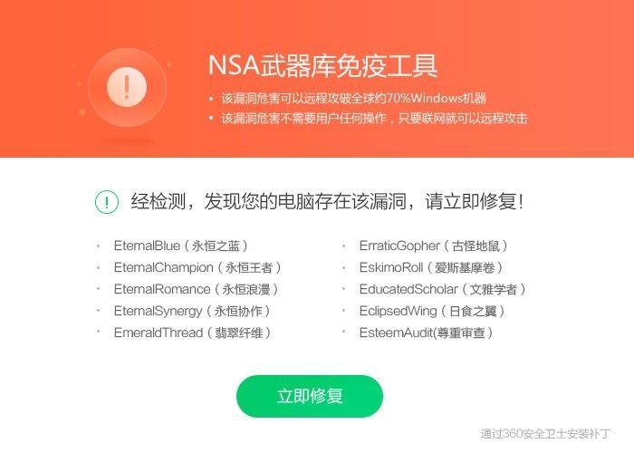 如果沒中毒,立即下載NSA武器庫免疫工具打補(bǔ)丁加固系統(tǒng),并下載文檔衛(wèi)士備份文檔