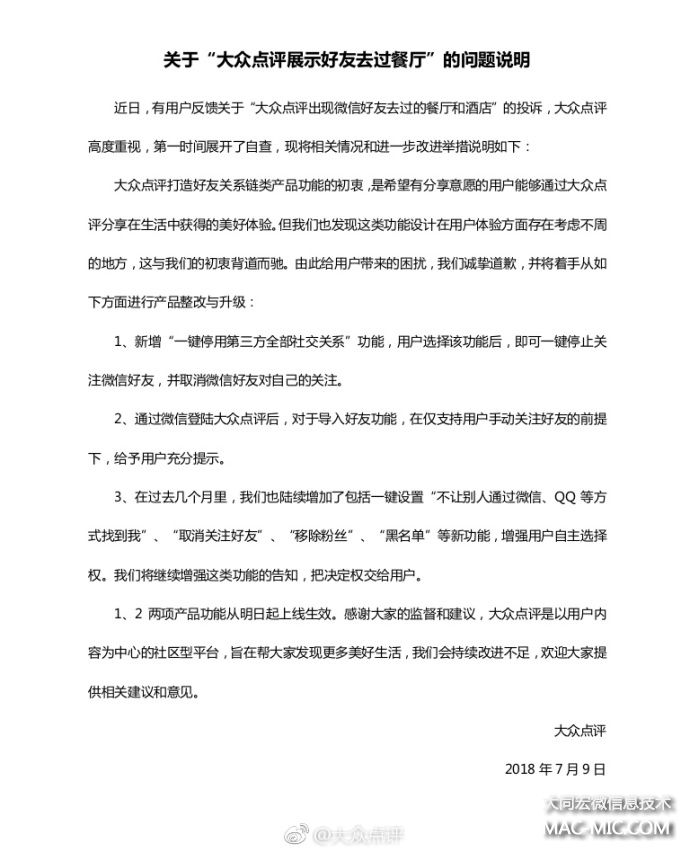 對此,大眾點(diǎn)評通過官方微博發(fā)布聲明,對因相關(guān)產(chǎn)品功能給用戶造成的困擾表示誠摯道歉,并提出了三條整改措施,包括新增“一鍵停用第三方全部社交關(guān)系”功能;通過微信登錄并導(dǎo)入好友關(guān)系,在支持用戶手動關(guān)注的情況下給予充分提示;增加包括一鍵設(shè)置“不讓別人通過微信、QQ等方式找到我”“取消關(guān)注好友”“移除粉絲”“黑名單”等新功能。