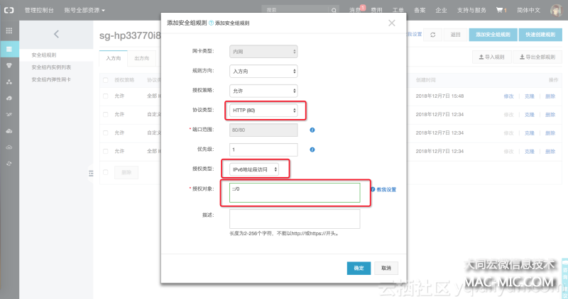 如果您的本機(jī)網(wǎng)絡(luò)支持 IPv6,可以為該實(shí)例 開通 IPv6 網(wǎng)關(guān)公網(wǎng)帶寬,然后直接在本地瀏覽器里輸入 http://[your_ipv6_address] 即可訪問(wèn), 需要注意在該實(shí)例的安全組里配置 IPv6 入方向 80 端口。如下圖所示: