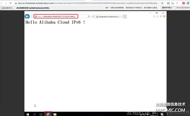 筆者由于本地網(wǎng)絡(luò)不支持 IPv6,因此又用上述步驟購(gòu)買了另一臺(tái) Windows 實(shí)例(配置好 IPv6),然后通過(guò) VNC(控制臺(tái)遠(yuǎn)程連接)連接該實(shí)例,然后通過(guò)瀏覽器訪問(wèn)上述第 7 步部署的 Web 服務(wù),如下圖所示: